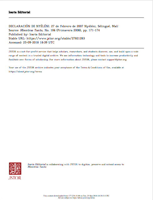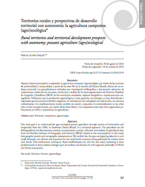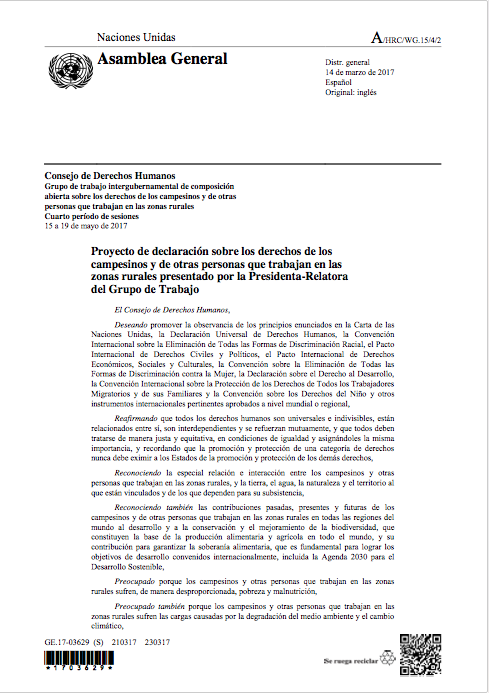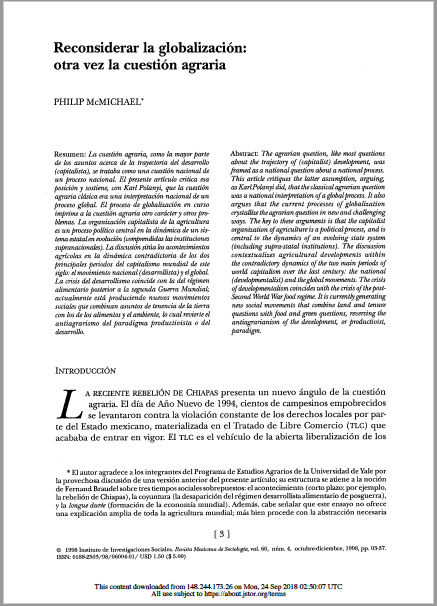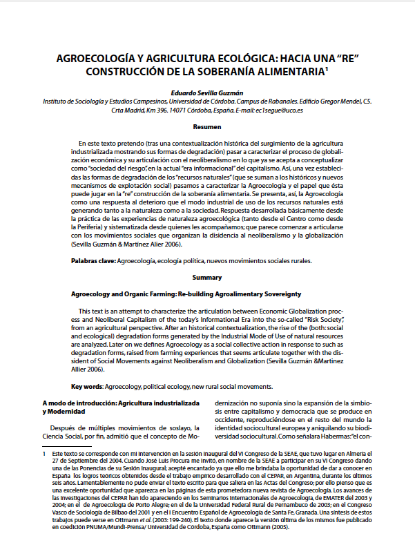FAO (2017b). Estado mundial de la alimentación y la agricultura, Roma, 201 pp. FAO, FIDA, OMS, PMA y UNICEF (2017). El estado de la seguridad alimentaria y la nutrición en el mundo 2017.Fomentando la resiliencia en aras de la paz y la seguridad alimentaria. Roma, FAO. 144 pp. Fernandez, Margarita, Goodall, Katherine, Olson, Meryl y Méndez, V. Ernesto (2013). Agroecology and Alternative Agri-Food Movements in the United States: Toward a Sustainable Agri-Food System, Agroecology and Sustainable Food Systems, 37:1, pp. 115-126. FIRA (2016). Panorama agroalimentario. Maíz 2016, Fideicomiso Instituido en Relación a la Agricultura, Dirección de Investigación y Evaluación Económica y Sectorial, 28 pp. Gumper, David (2009). The raw milk revolution. Bheind America’s emerging battle over food rights, Chelsea Green Publishing, White River Junction, Vermont, Hernández, María del Carmen, Andablo, Araceli y Ulloa, Antonio (2018) “La industria avícola del siglo XXI. Tendencias y expectativas para los grupos sociales más vulnerables” en Calva, José Luis, México 2018-2024. Nueva Estrategia de Desarrollo, Editorial Juan Pablos, en prensa. Hernández, María del Carmen, Andablo, Araceli y Ulloa, Antonio (2012). “Agricultura familiar sustentable y seguridad alimentaria. ¿Una salida viable a la crisis alimentaria?” en M.C. Hernández y J.M. Meléndez (ed.), Alimentación contemporánea: un paradigma en crisis y respuestas alternativas, AM editores, México, pp. 251-278. Jestor (2018). Portal de búsqueda, consultado en: https://biblioteca.ciad.mx:2384/action/doBasicSearch?Query=food+sovereignty+&acc=on&wc=on&fc=off&group=none* Mora Delgado, Jairo y Martínez Restrepo, Gloria Lucía (2015). Seminario Internacional Soberanía Alimentaria y Gestión TErritorial. Boletín Divulgativo, Ibagué, julio 2016, Vol. 5 (1) de la Red de Estudios Rurales, 42 pp. Rubio Vega, Blanca Aurora (2011). “El declive de la fase agroexportadora neoliberal en el contexto de las crisis capitalista y alimentaria” en M.C. Hernández y J.M. Meléndez (ed.), Alimentación contemporánea: un paradigma en crisis y respuestas alternativas, AM editores, México, pp. 31-50. Springer Link (2018). Portal de búsqueda consultado en https://biblioteca.ciad.mx:2132/search?query=Food+sovereignty. Vía Campesina (portal) (2018). La Vía Campesina: La voz de las campesinas y de los campesinos del mundo, Disponible en https://viacampesina.org/es/la-via-campesina-la-voz-las-campesinas-los-campesinos-del-mundo/ Taylor Francis Online (2018). Portal de búsqueda, consultado en: https://www.tandfonline.com/action/doSearch?AllField=Food+sovereignty*